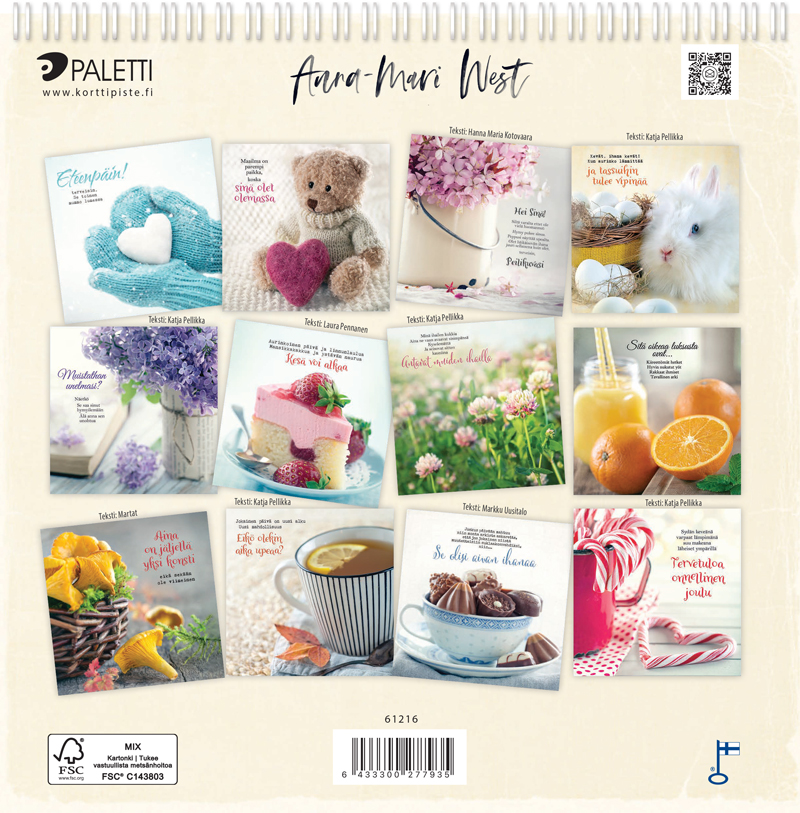 Anna-Mari West -seinäkalenteri vuodelle 2026, materiaali mattakartonki. Koko 20,5 x 20,5 cm.